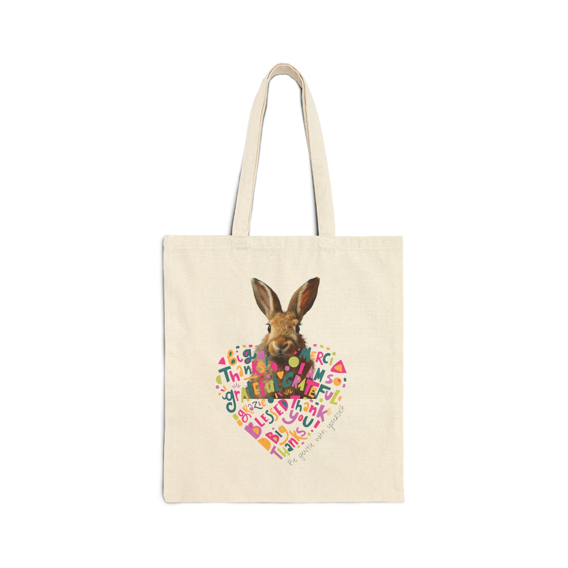 • Embrace the spirit of thankfulness with our Grateful Bunny Heart Tote Bag. This bag showcases a cute bunny in the center of a vibrant heart, adorned with words like "Merci," "Blessed," and "Thankful." Made from sturdy canvas, it’s ideal for shopping, carrying books, or as a go-to bag for daily adventures. Show off your love for bunnies and positivity with this delightful accessory.
