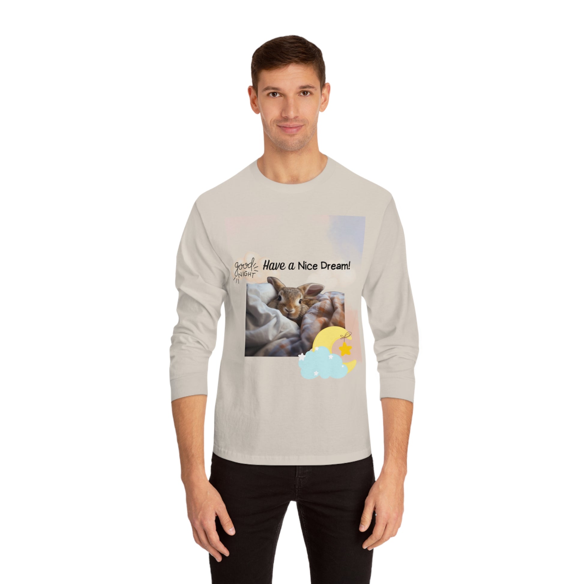 • Get ready to cuddle up in our Cuddle Up Bunny Nightwear Shirt. The delightful design of this long-sleeve tee features a sweet bunny nestled in blankets, accompanied by a comforting "Good Night, Have a Nice Dream" wish. Crafted from soft and cozy material, this shirt is designed to help you relax and unwind. It's a must-have for anyone who loves to add a touch of cuteness to their nighttime routine. • Embrace the cozy vibes of bedtime with our Sleepy Time Rabbit Long-Sleeve Tee. This shirt showcases a cute bunny ready for slumber, surrounded by soft clouds and a crescent moon. The soothing "Good Night, Have a Nice Dream" text adds a calming touch, making this tee perfect for those who cherish a good night’s rest. Whether you're lounging around or heading to bed, this shirt will keep you snug and stylish.